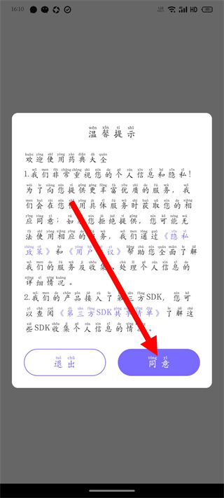 1、打開中國(guó)藥典,在溫馨提示彈窗中點(diǎn)擊同意。