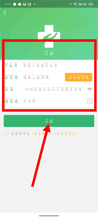 4、依次填寫(xiě)手機(jī)號(hào)、驗(yàn)證碼等信息,點(diǎn)擊注冊(cè),完成注冊(cè)。