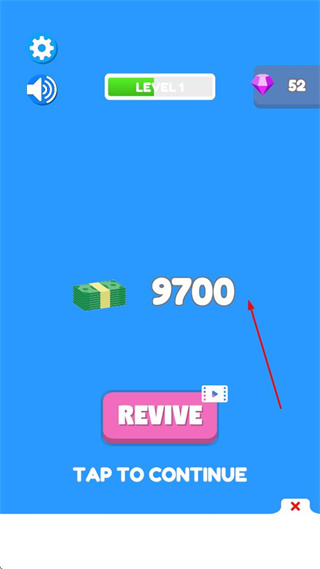 4、若挖礦過(guò)程中失敗,會(huì)顯示獲得的金錢數(shù)量,可選擇REVIVE或點(diǎn)擊TAP TO CONTINUE繼續(xù)游戲,積累的金錢可用于后續(xù)升級(jí)等操作。