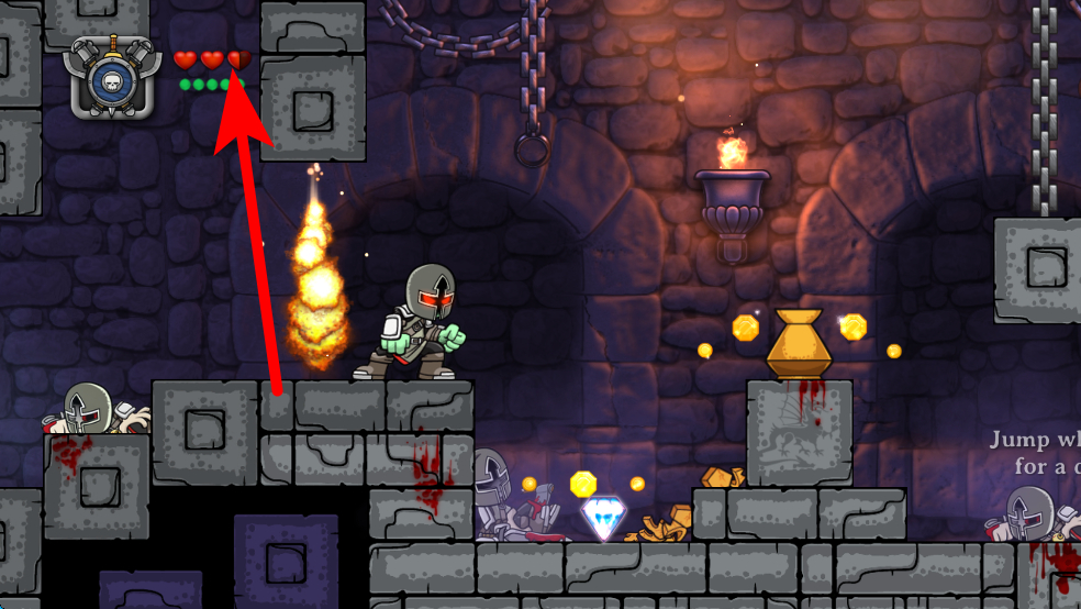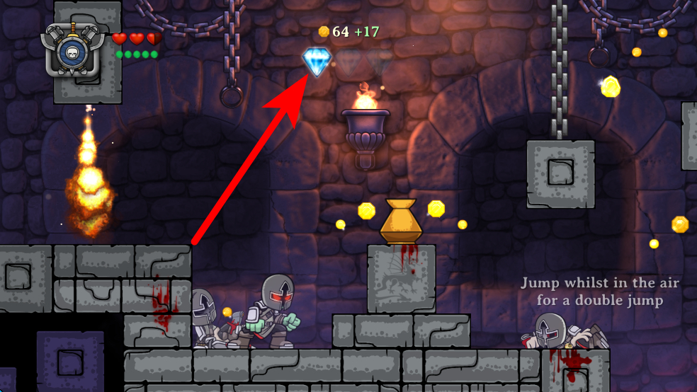 1、進(jìn)入游戲后,選擇Newgame開啟新冒險(xiǎn),操控角色在城堡場景中移動(dòng),可通過跳躍等操作躲避火焰等陷阱,同時(shí)留意周圍怪物,準(zhǔn)備戰(zhàn)斗。