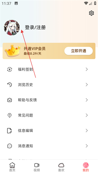2、在個人頁面,點擊登錄注冊,進入登錄注冊頁面。