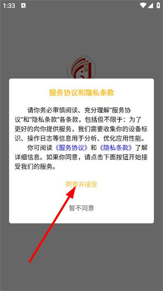 1、在服務(wù)協(xié)議和隱私條款彈窗中,點(diǎn)擊同意并接受,進(jìn)入軟件。