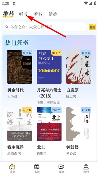 2、在軟件主界面,點(diǎn)擊頂部的聽書,進(jìn)入聽書頁面。