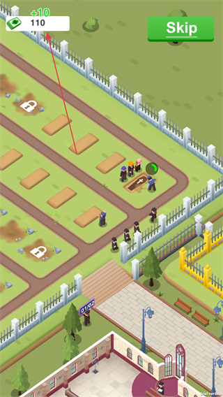 4、完成下葬任務(wù)后,獲取金錢獎勵如+10,金錢數(shù)值變?yōu)?10,繼續(xù)進(jìn)行后續(xù)的殯葬業(yè)務(wù),解鎖新區(qū)域和功能。