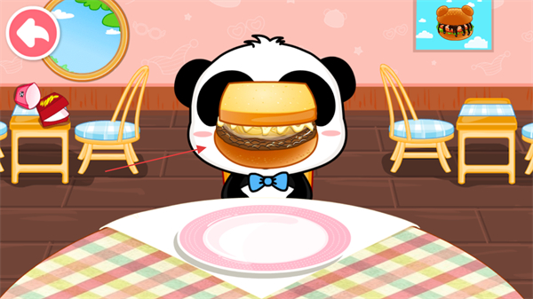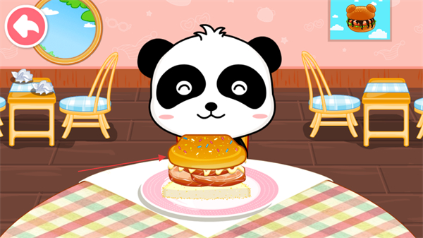 4、將制作好的漢堡呈現(xiàn)給熊貓角色,讓它享用,完成一次美食制作任務。