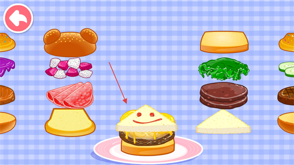 2、切換到食材選擇界面,從眾多食材中挑選心儀的食材,比如芝士、肉餅等,點擊食材拖放到盤子上進行組合。