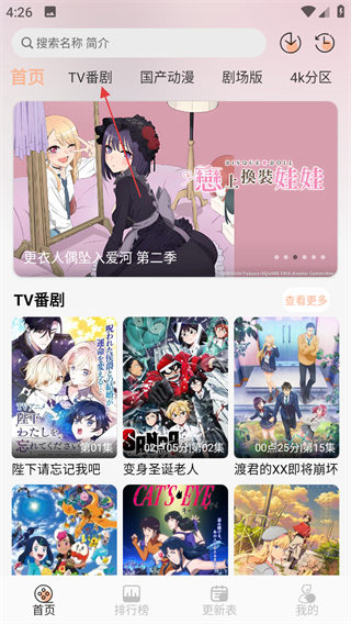 1、進(jìn)入軟件首頁,點(diǎn)擊頂部TV番劇標(biāo)簽,進(jìn)入TV番劇分類頁面。
