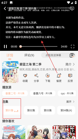 3、在番劇播放頁面的選集區(qū)域,選擇第1集觀看番劇內(nèi)容。