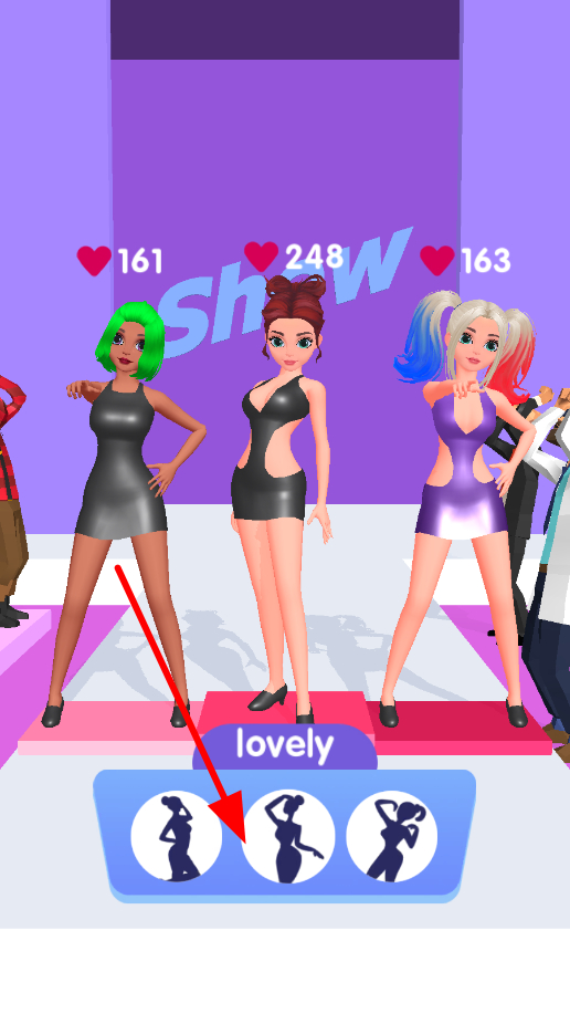 3、展示造型環(huán)節(jié),從姿勢選項中挑選合適的姿勢,讓角色呈現(xiàn)出更具魅力的姿態(tài),增加得分。