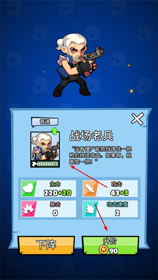 1、可對戰(zhàn)場老兵角色進行升階,花費90金幣能提升其生命、攻擊等屬性,增強戰(zhàn)斗能力。