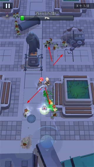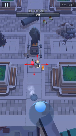 2、在關(guān)卡中,操控角色移動,目標是消滅所有僵尸,通過移動躲避僵尸攻擊并尋找攻擊機會。