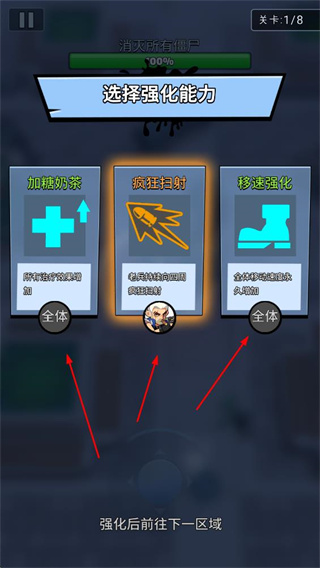 4、消滅所有僵尸后,會出現(xiàn)選擇強化能力界面,可選擇加糖奶茶、瘋狂掃射、移速強化等強化效果。
