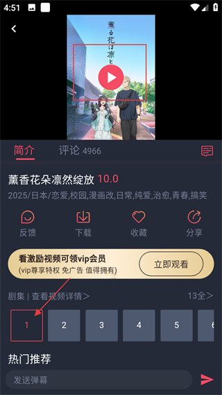 4、在日漫播放頁面,點(diǎn)擊播放按鈕,選擇1集,開始觀看日漫內(nèi)容。