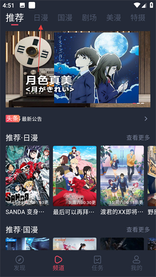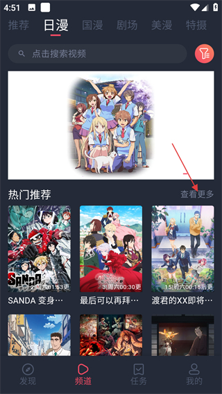 2、在日漫分類頁面,點(diǎn)擊熱門推薦旁的查看更多,進(jìn)入全部視頻頁面。