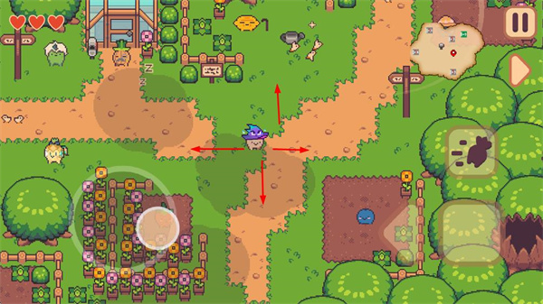 1、在游戲場景中,可操控角色在不同區(qū)域移動,探索包含農(nóng)田、樹林等的地圖,發(fā)現(xiàn)各種場景與元素。