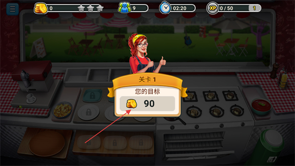 1、進(jìn)入關(guān)卡1,查看目標(biāo)是賺取90金幣,準(zhǔn)備開始烹飪。