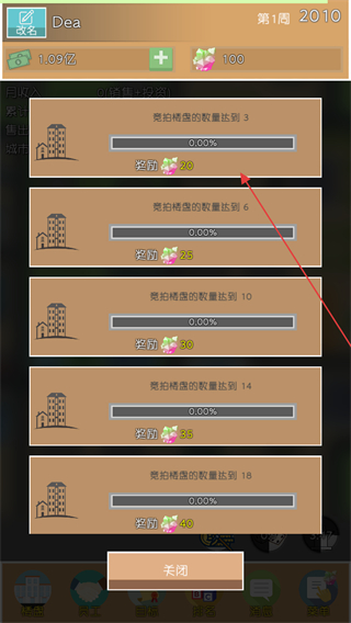 1、查看任務(wù)界面,了解任務(wù)目標(biāo),如競拍樓盤的數(shù)量達(dá)到3,明確努力方向。