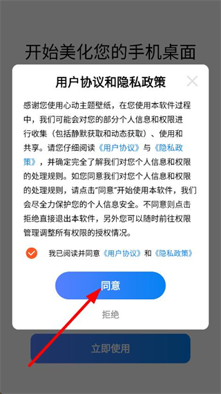 1、在用戶協(xié)議和隱私政策彈窗中,點(diǎn)擊同意,進(jìn)入心動主題壁紙主界面。