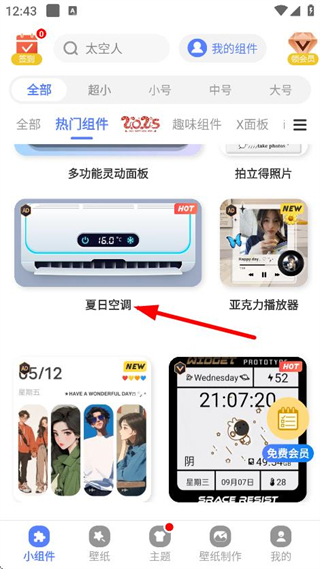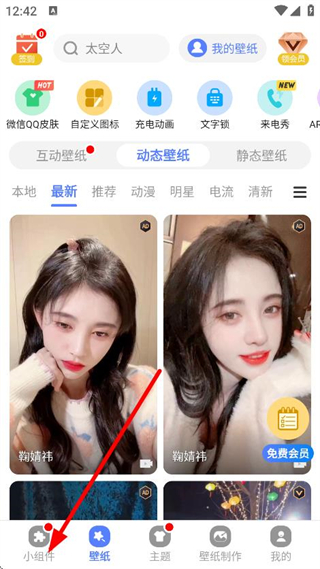 2、在心動主題壁紙主界面,點(diǎn)擊底部的小組件,進(jìn)入小組件選擇頁面。