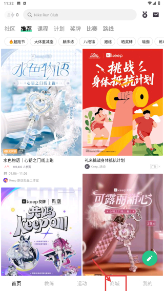 1、打開Keep應(yīng)用,點(diǎn)擊底部商城選項(xiàng),進(jìn)入運(yùn)動商品商城頁面。
