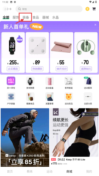 2、在商城頁面,點(diǎn)擊裝備分類標(biāo)簽,切換到運(yùn)動裝備展示區(qū)。