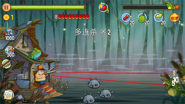 2、戰(zhàn)斗場景中,操控角色使用槍械射擊鱷魚等敵人,界面顯示生命值、能量值和擊殺連殺數(shù),擊敗敵人獲取分?jǐn)?shù)。