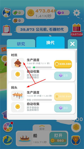 4、進(jìn)入換代界面,升級(jí)村民、碼頭等建筑的生產(chǎn)速度,優(yōu)化資源產(chǎn)出效率,持續(xù)推動(dòng)文明向更高時(shí)代發(fā)展。