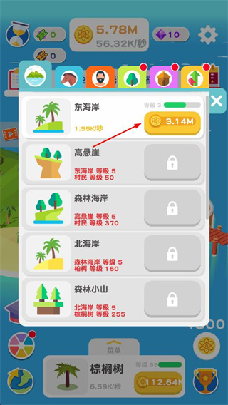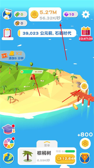 1、點擊島嶼上的資源點收集金幣,同時升級建筑提升資源產(chǎn)出速度。
