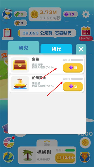 3、進入換代界面,花費鉆石升級寶箱、船用黃金等增益項,增加資源收入加成,優(yōu)化資源獲取效率。