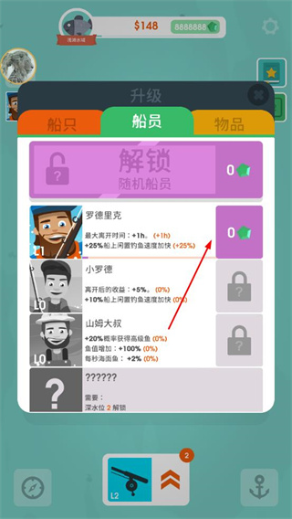 4、解鎖船員,提升釣魚相關(guān)屬性,優(yōu)化經(jīng)營(yíng)效率,持續(xù)推動(dòng)游戲發(fā)展。