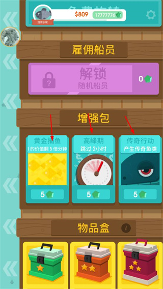 4、花費綠寶石購買增強(qiáng)包,提升釣魚收益、加速游戲進(jìn)程或獲取傳奇魚類。