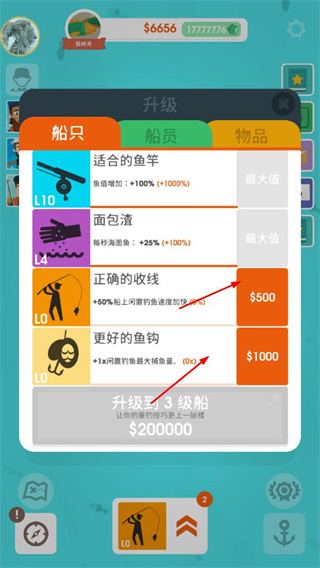 2、進(jìn)入升級(jí)界面,花費(fèi)金錢升級(jí)漁具,提升釣魚效率和收益,為經(jīng)營(yíng)發(fā)展奠定基礎(chǔ)。