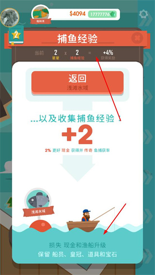 3、收集捕魚經(jīng)驗(yàn),提升經(jīng)驗(yàn)等級(jí)獲取獎(jiǎng)勵(lì),同時(shí)了解升級(jí)時(shí)的損失與保留規(guī)則。