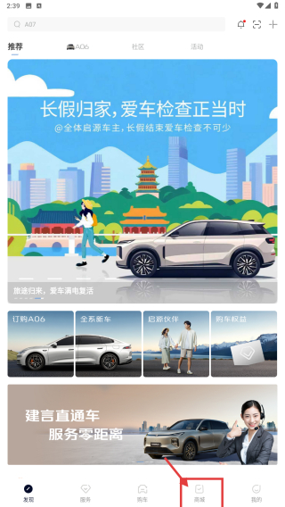 1、打開汽車類應用,點擊底部商城選項,進入商城頁面。