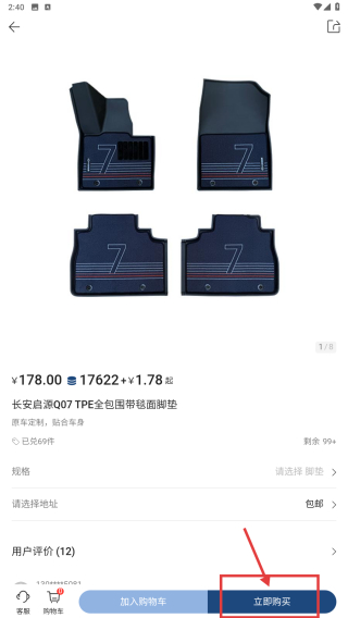 4、在商品詳情頁,點擊立即購買按鈕,進行腳墊購買操作。