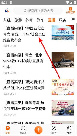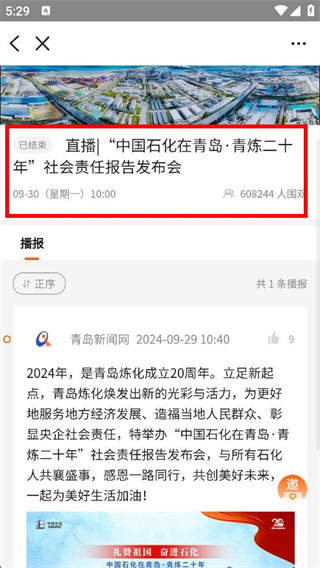 2、在直播內(nèi)容列表頁面,點擊直播實錄中國石化在青島·青煉二十年社會責(zé)任報告發(fā)布會,進入該直播詳情頁面。