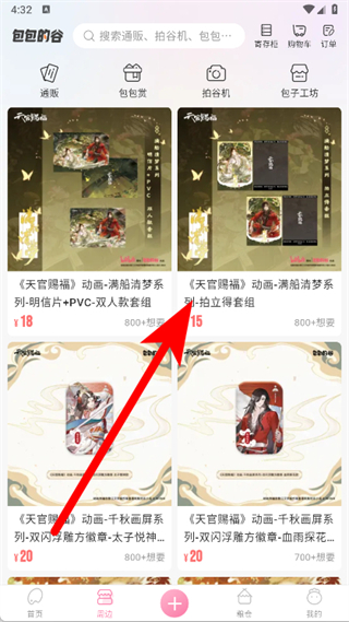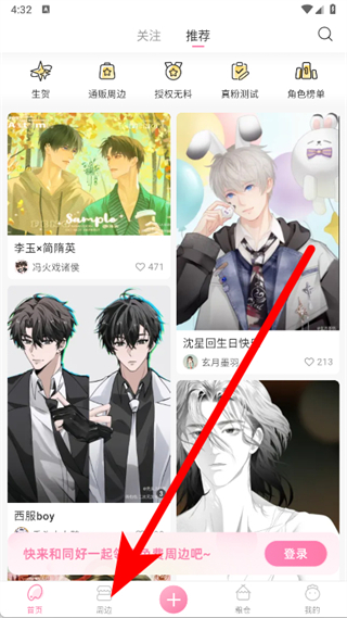 1、打開畫包包,在首頁瀏覽推薦的二次元文創(chuàng)內(nèi)容,點擊底部集市周邊,進入商品展示頁面。