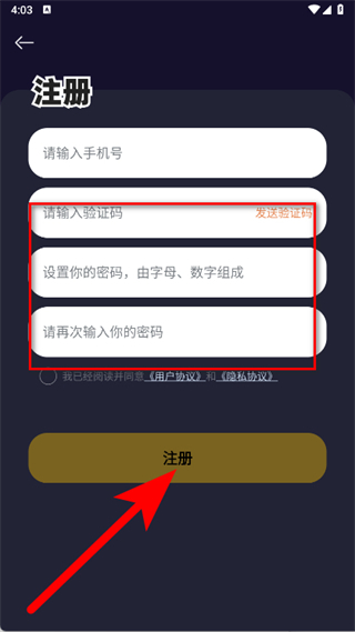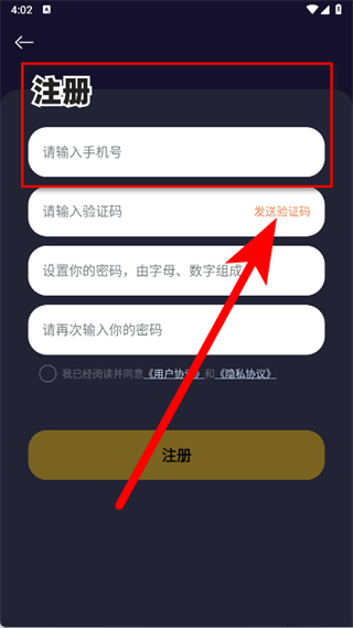 3、在注冊頁面,輸入手機號,點擊發(fā)送驗證碼,然后輸入收到的驗證碼。
