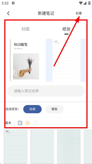 3、設(shè)置封面、紙張樣式,輸入筆記名稱后,點(diǎn)擊右上角創(chuàng)建,進(jìn)入筆記編輯頁面。