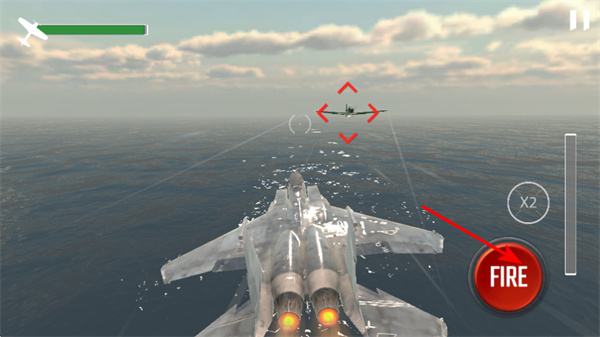 3、發(fā)起火力攻擊,瞄準敵方目標后,點擊FIRE按鈕,發(fā)射彈藥攻擊敵方戰(zhàn)機,爭取摧毀目標。