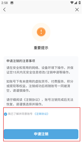 5、在重要提示頁(yè)面,勾選同意后點(diǎn)擊申請(qǐng)注銷可完成賬號(hào)注銷操作。