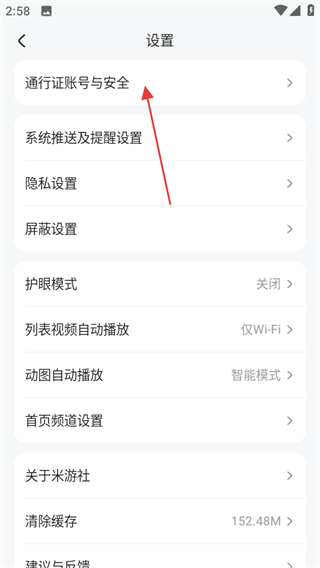 3、在設(shè)置頁(yè)面,點(diǎn)擊通行證賬號(hào)與安全可進(jìn)入賬號(hào)與安全頁(yè)面。