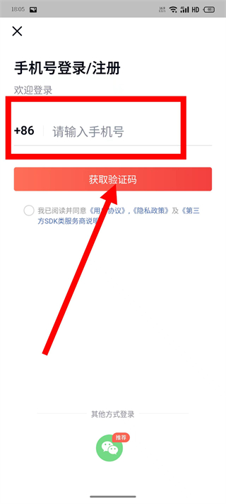 3、在登錄界面,輸入手機(jī)號(hào)碼后,點(diǎn)擊獲取驗(yàn)證碼按鈕。