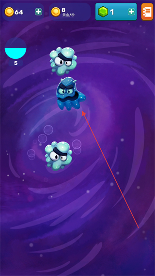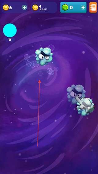 1、操控藍(lán)色泡泡狀怪物移動,收集氣泡積累分?jǐn)?shù)。