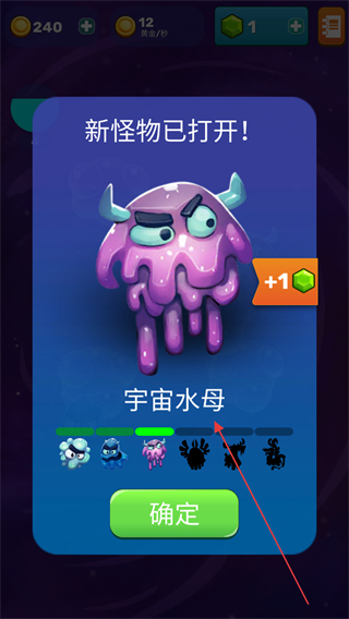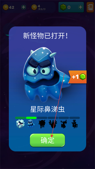 4、解鎖宇宙水母后點擊確定,獲得新怪物和綠寶石,繼續(xù)拓展怪物陣容。