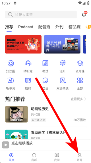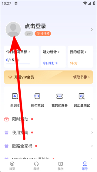 1、打開(kāi)每日英語(yǔ)聽(tīng)力,點(diǎn)擊底部賬號(hào),進(jìn)入個(gè)人頁(yè)面。