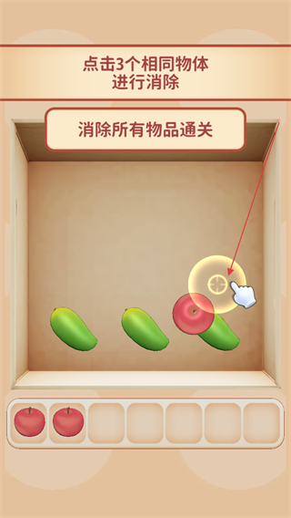 2、當收集欄中同類型物品達到三個時,自動消除這三個物品。
