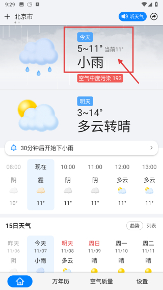 4、在北京市天氣頁面,查看今天小雨、氣溫5~11°的天氣信息。