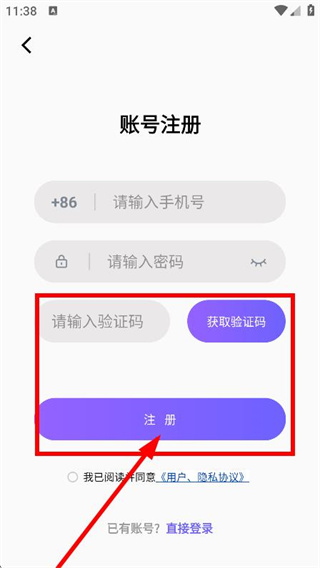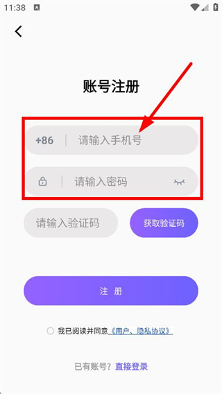 3、隨后我們在賬號注冊頁面,輸入手機(jī)號、密碼。
