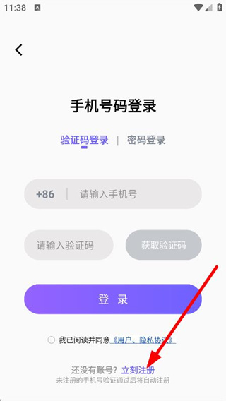 2、在手機(jī)號碼登錄頁面,點擊立刻注冊,進(jìn)入頁面。